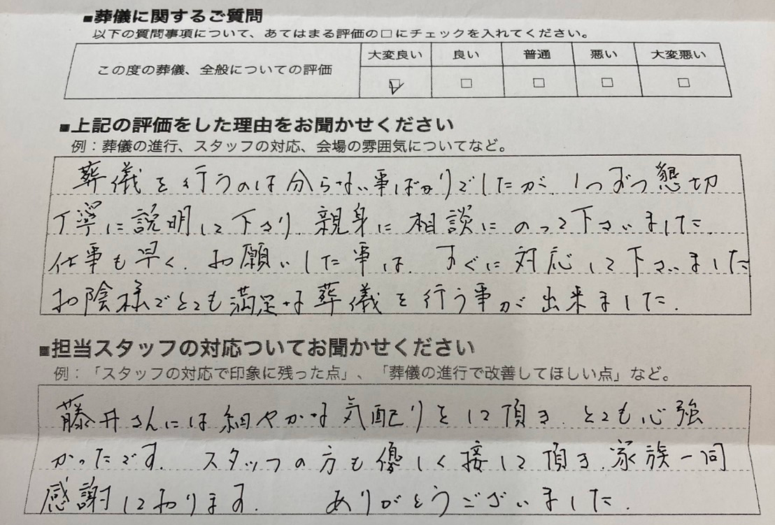 お陰様でとても満足な葬儀を行う事が出来ました。